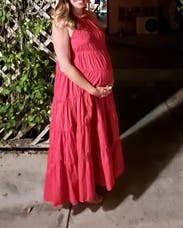 I love a good high neck dress. I rented this once before (not pregnant) and rented again and liked it even more pregnant. Very comfortable and bump friendly. I wore at 26 weeks. Fabric is a little on the thick side but since the dress is so flowy this didn't bother me