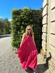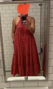 Love this dress - so full and extra but comfy and stylish. The neck tie rolls a little funny but I pressed it out, light and loose, perfect vacation dress!