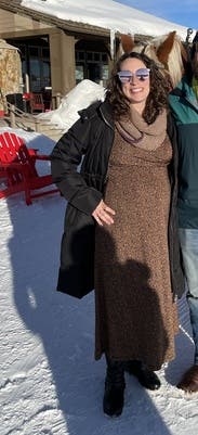 Wore this to thanksgiving a month before baby and it was perfect! Hugged all the right spots to show off my bump but was also light weight and comfy for sitting on the couch after dinner.