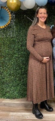 I absolutely adored this dress!! I wore it for my maternity photoshoot and it looked amazing! It fit so well and stretched nice at 8 months pregnant. Perfect for the fall!