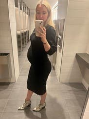 This dress worked well, fit over my bump (23 weeks), was a nice black work dress to accentuate with earrings or nice shoes. Four stars because it was nothing to write home about, no compliments nor anyone noticing much because a black work dress is a black work dress. Had kind of a sewn-in line down the middle of the chest which could look a bit odd but not super noticeable. Size M, my pre-pregnancy dress size, worked well.