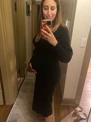 Was so worried when I first tried it on - it’s definitely tough to squeeze into during the late third trimester, but it fits like a (tight yet comfy) glove once it’s on. Fabric is sweatshirt-y at the top and knit at the bottom. One of the most flattering pregnancy dresses I’ve rented!