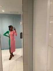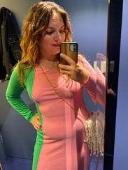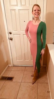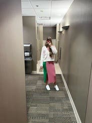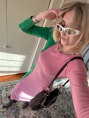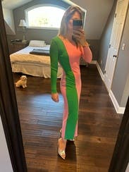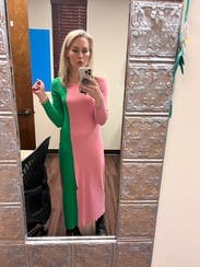 Hated to send this one back, it was so comfortable, fun and cute. Material is soft and was perfect for a breezy spring day. I would’ve never thought to pair pink and green with black accessories before the model’s styling template. Glad I dared to try my own twist on it!