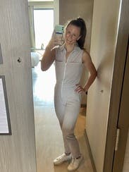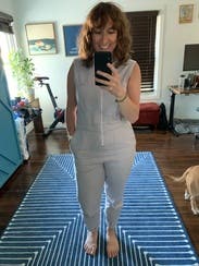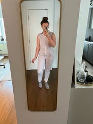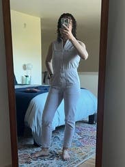 I LOVE this jumpsuit. The color is so unique (it’s a very pale lavender). My only complaint is I felt like the legs were a little snug but I do think it’s supposed to fit that way. I just prefer jumpsuits to be on the looser and loungey side. If I rent this again I think I would size up.