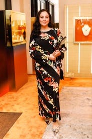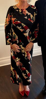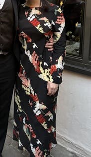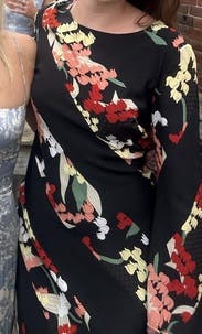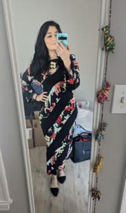 This Rixo dress features a bold floral print on a black backdrop, offering a vibrant yet elegant aesthetic. The mid-length cut and long sleeves make it versatile for various occasions. Pair with simple heels to let the dress take center stage.