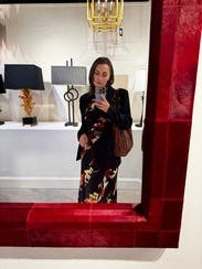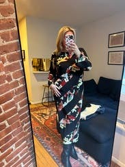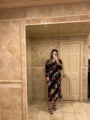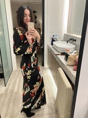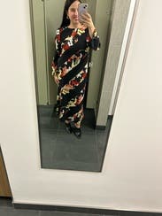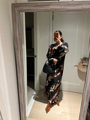 Such a cute dress! Sized up to have a roomier fit so that the dress wouldn’t feel so formal fitting. I’m 5’1 and this dress hit at my ankles (petite friendly!!!). This is a very thin lightweight material. Wore out to dinner with a fun suede boot, but this could be a great cocktail occasion style with a little heel!
