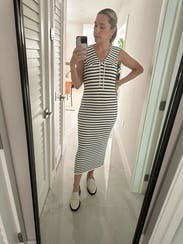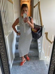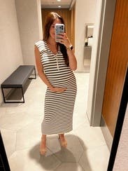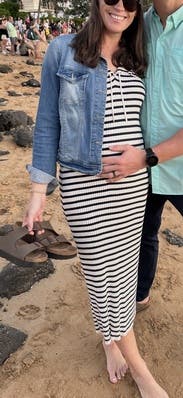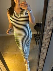 Loved this striped sailor inspired dress! I wore this at 33 weeks pregnant and it was perfect. It’s very comfortable and stretchy for a growing belly! I would absolutely rent again!