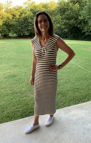 Despite the horizontal stripes, this dress is very flattering. And though it is formfitting, it’s not too clingy. It is very soft and comfortable. Wish I could buy it!