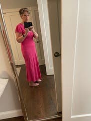 Pink satin (100% Viscose). A-line. Short sleeves. V-neck. Side zipper closure. 52" from shoulder to hemline. Imported.
