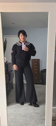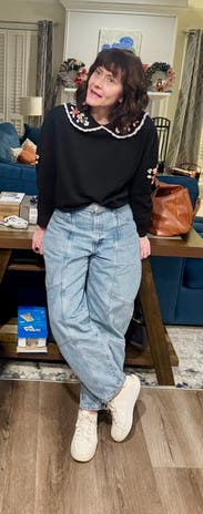 I wore this for my fantasy book club night! I love the embroidery and the fabric is soft and not itchy at all. I was worried the stitching might be itchy but it wasn’t. It’s slightly cropped but I really liked that. If you don’t want it oversized size down. That’s what I did here!