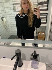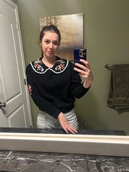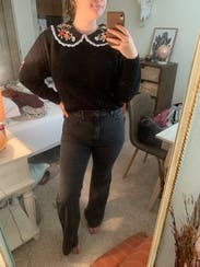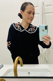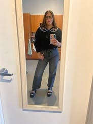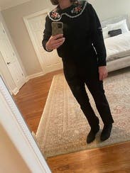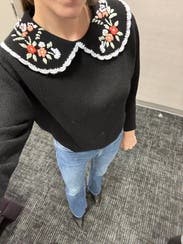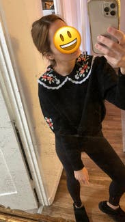 This sweater is adorable! Love the Peter Pan collar… though I was surprised the “white” edging in the picture is actually pale blue. Still cute! A little bit scratchy. I could have gone medium or large on this.