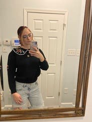 Love this sweater. Wore it to work and casual holiday brunch with high waisted pants and loafers. Adorable. Lots of compliments. Size down. Will hold on to this one for a bit!!
