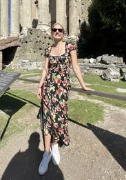If you are a tall girl like me, this dress is perfect! It hits at just the right spot on the legs (which can be hard to find with midi dresses). Material is lightweight and a tad sheer, but nothing bad and still perfect for hotter days. I'm usually a small, but got an XS in this, and it fit amazingly.
