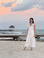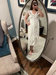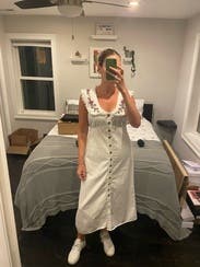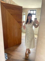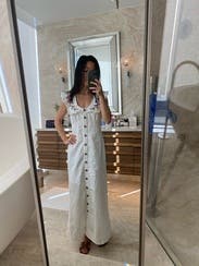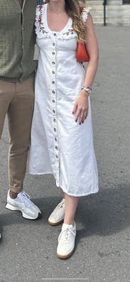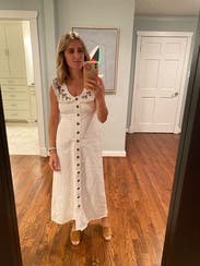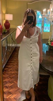 This dress is so gorgeous and so comfortable. I wore on vacation in Mexico and it was perfect. Love the white denim and it was so soft and comfy. I’m 5’9” and the length felt perfect with some heeled sandals.