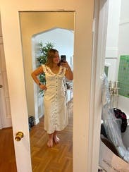 I wore this dress to my rehearsal dinner which was a themed country western hoe-down. I wish I owned this dress! Despite wearing it for a themed party, I could easily wear this again in the summer. The fit in the bust is a little tight, but once on and buttoned fit perfectly. The details on the lapel were so cute and dainty. Highly recommend!