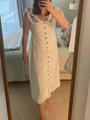 As someone who is often between a 6-8, it felt strange that a medium had as much hip room as it did! Otherwise, the dress was comfy, easy to move in, and was almost too long for me, but it was still cute and I'm so glad I wore it to my rehearsal dinner! I loved the neck detail/embroidery, and I thought it was formal enough for a brewery rehearsal dinner.