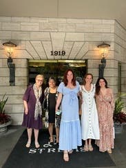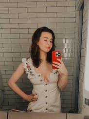 Felt very virtuous but not plain in this dress. Super high-quality material and craftsmanship. Really pretty color with cute embroidered detail. In a sea of a lot of the same looking dresses, this one felt different and unique.