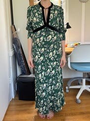 It is such a simple dress but was lovely on. I chose this dress for the colors because my cousin's colors were green, cream, gold, and black. For the ceremonies, she had her family where the traditional Chinese dresses and this dress had a semi-mandarin collar so I felt like I fit in without barging - you know? It is flowy but not as forgiving when eating but still so comfortable. I think this was a medium. My brother and I complimented each other which was nice. And yes, it does look like avocados...and they make things better so - rent this dress!