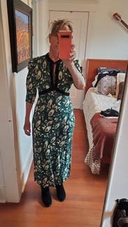Not the best photo for the dress but absolutely loved it! Fits like a glove on a curvy figure. Got so many compliments and it was comfy enough wear while cooking and serving thanksgiving dinner!