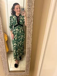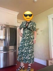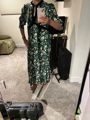 I wore this to our anniversary dinner! I loved the color and print of the dress. The dress fit right, but it does do a weird thing to where you need to perfect undergarments for the dress. The keyhole in the chest makes it hard to find the appropriate undergarments but I made it work with a few safety pins 😅 other than that I did love this dress! 👗