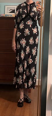 Loved this dress! I wore it to a wedding that was in-between fancy and casual, and thought it did the trick. I ended up wearing a large — the slight tulip-shape of the skirt accentuated my stomach with the medium, even though overall the medium fit better. But the large was fine, although long (I’m 5’7” and it came to my ankles). The V-neck cutout in front is quite low. I wish I would have worn a black bra instead of a flesh-colored one, but it wasn’t that noticeable. I really liked the dramatic colors — dark background with bright flowers. It was flowy and fun. I would rent this dress again!