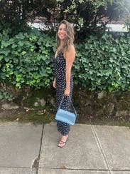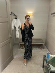 Rixo x RTR’s Sandrine Midi Dress brings vintage-inspired elegance with its bias-cut silhouette and playful polka dot pattern. Style it with block heels and a mini clutch for a polished summer soirée look.