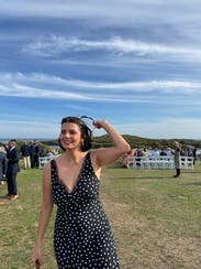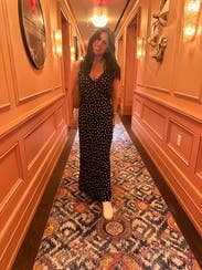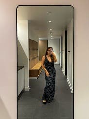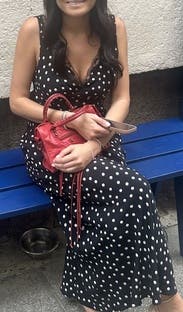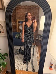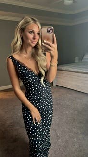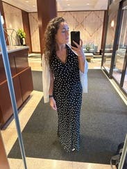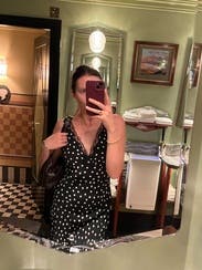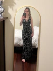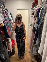 Great version of the polka dot trend! Deep V cut so you definitely need a sticky bra to keep the girls in and perky. It was the perfect length for a short girlie to even wear with sandals while on vacation in Europe! May rent again as I Would love to see how it would look also styled with a turtleneck under it in the winter! 8.5/10 just because I felt like I was in between sizes