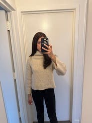 I loved this sweater from the moment I put it on. It’s so warm and cozy, perfect for fall into winter. Not itchy at all. The neckline is a comfortable mockneck that doesn’t feel restricting and gives you just the right amount of warmth. The yarn has a long fuzzy type hair on it that makes me feel like it would be hard to machine wash without it pilling (tag does say dry clean only). If it wasn’t for that I would’ve bought it in a heartbeat!
