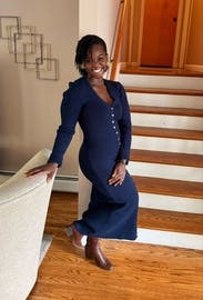 Okay! My review includes a few warnings so you know what to anticipate before it arrives, don’t let them scare you. This is a perfect sweater dress. Don’t skip it! I would call it a basic you could choose to dress up or wear as is. The V-neck is lower than I realized before renting, but as someone who prefers modesty, I was okay with the amount of cleavage. The material has some give, so a medium might have worked for me. I would say it runs TTS. However, if you’re hourglass or pear-shaped, consider going up one size (or choosing the larger size if you’re between sizes) because it hugs the lower half. You’re going to look sexy in this if you have a sizable derrière, just accept that, LOL. If you carry more weight in your midsection, be cautious; the dress isn’t very forgiving. I wore a light-squeeze shapewear underneath, which helped me feel comfortable. The sleeves are long; folding them didn’t take away from the style. 💙🩵
