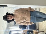 Fit perfect. Great camel color. Looked great on. Very good quality. Really cute sweater. And warm.