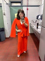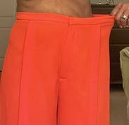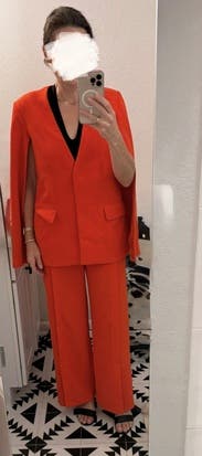 These pants are bright orange and have a fun split hem. I would suggest sizing down though. The crepe material is light and darker undergarments are visible. Although the set it fun, I like the pants better than the jacket.