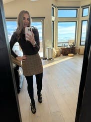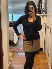 This is a great tweed collegiate feeling skirt - Taylor swift bookstore vibes! If you are tall it might be slightly too short for work - I paired with tights to soften it.