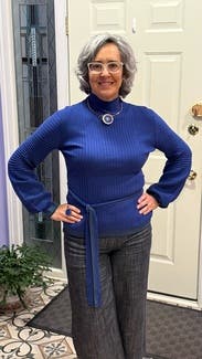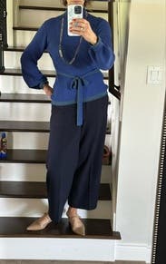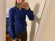 The details on this sweater stepped it up and made it feel elegant. The neck has 3 gold buttons at the back of the neck, the sleeves puff from elbow to wrist, and the belt is an ample length to be tied a variety of ways. I love the cobalt blue color. The trim was kind of a greenish color. I enjoyed wearing this sweater.