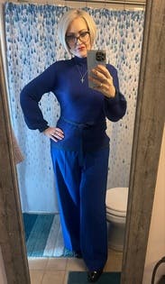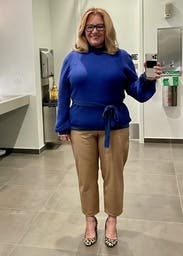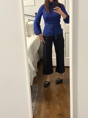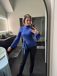 Beautiful blue top...looks great with the black pants that I wore. I don't love the tie at the waist & it may look better if you had a unique belt to pair with it instead.