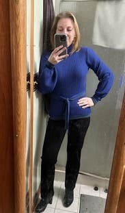 This sweater is lighter weight than I was expecting and I didn’t notice the ribbing details when I ordered but I loved it. Super flattering and I may purchase. I wore with straighter fit black pants to work but it would also be really cute with jeans or with looser trousers too!