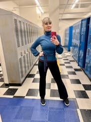 Wonderful turtleneck; I wore it a couple of times and enjoyed it. The contrasting burgundy color, the neck buttons, and the little pouf in the sleeve are all high-quality details that made the look. I didn't love the belt, but it was fine.