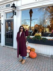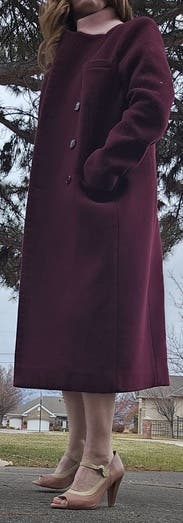 Very chic BUT a touch too long. Basically a floor length coat for a 5'2" gal like me. I liked the pop of pink in the collar but it may not be for everyone.