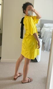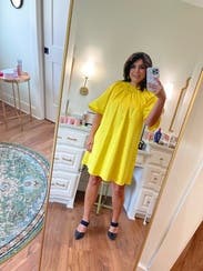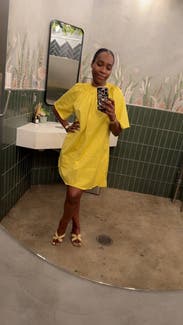 Love how vibrant this yellow is! Would be super fun for a summer event. The tie in the back is such a cute detail that adds a feminine flare. Such an easy dress to throw on and can easily be dressed up or down. Fits true to size, but since it's a shift dress there is definitely an oversized look.