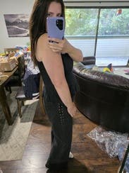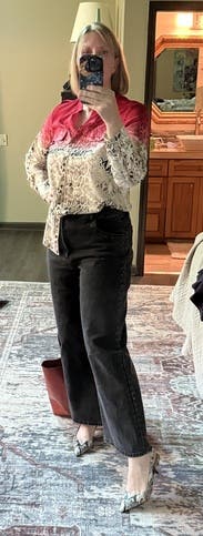 I loved these jeans and wore them styled many different ways (here is my snakeskin shirt and shoes... don't judge for the half tuck, I was trying something!). These are really great shape that is comfortable all the way around and fit well through waist, hips and things. I would have loved a tall but these were fine with flats for 5'8". The fabric is a bit heavy/stiff, but honestly these were new-with-tag when they came to me so they may soften up just a bit! The real treat is the eyelets all the way down the side and around the pockets - it's just a hint of flash and edge, but not so much that it drives the overall style or YOU need to veer toward edgy styling to be comfortable. A very mature take on Rock and Roll. My rating approach: (5=LOVE LOVE; 4=Will rent again, a couple of details I would change; 3=Works but meh; 2=Won't rent again, but may work in some cases; 1=This should be burned). I am on RTR to try new styles and find sizes for my post-menopausal weight/body shape.