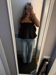 I did size up, but probably didn’t need to, because I needed to wear a padded bra to keep it up. I wore this with long wide leg jeans and heels. So many compliments! Fun for a date night.