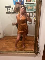 I absolutely adored this dress! The little leaves and flowers stitched on it were my favorite part. I wore it to and art show and it was the perfect cocktail dress for fall! It's unique and the color definitely stands out, but I really liked the almost shimmery burnt orange. It does wrinkle really easily, so something to keep in mind. But it fit really well, was long enough that I felt comfortable sitting and moving around, and the top held my D chest in place which I also appreciated.