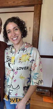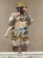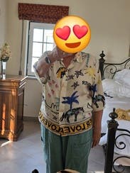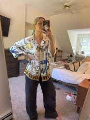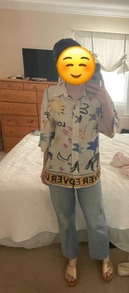 Fun shirt, runs big but that is the style. Wore the set on the plane and on vacation and it was comfortable but with a statement.