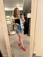 Can be dressed down with matching shorts set or paired with jeans. Box style so not very flattering but colors and pattern was fun!