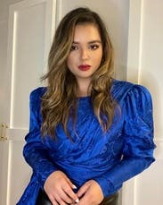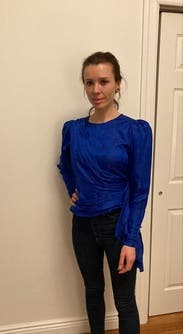 Beautiful sapphire colour & slight sheen to material, formal enough for work event or smarty dinner, I loved it - only thing is it runs quite short & is tight to do up - this size fit me ok though once on. Best w high-waisted trousers!