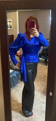 This top is gorgeous on and I received so many compliments when I wore it out to dinner. The color is so vibrant and beautiful. Definitely recommend!!