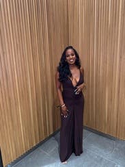Brown (90% Polyester 10% Spandex). Gown. Plunge. Sleeveless. Back zipper closure. See the fit notes for more information. Imported.