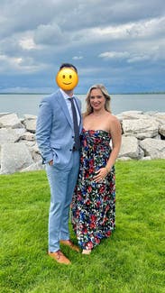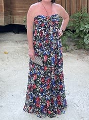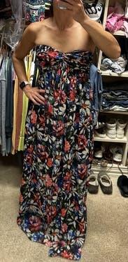 This dress was so much fun to wear to a formal wedding. I did have to use some fashion tape to keep the bust in place, and I ended up tying the neck straps around the back to keep a strapless silhouette. It was a little small in the chest, but fit very comfortably everywhere else for trying to hide an 8-week pregnancy! This dress was SO long even with nearly 4 inch platform heels. I had to knot it at the bottom for the dance floor, so would recommend this dress for taller folks!