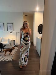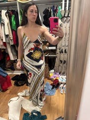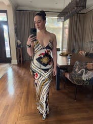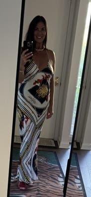 The fit of this dress is perfect. Because it’s a petite, it is super flattering and true to size! The straps are a bit too long but could easily be adjusted for a one-night wear. I’m not a huge fan of the pattern — the triangle detail lands in a weird spot and kind of looks like a bikini bottom — but the overall cut is gorgeous and really flattering. I just wish it came in other colors because I love the fit!