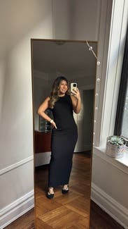 Now that I'm writing this review I'm trying to figure out why I'm sending this dress back. It is form fitting, but a nice heavy fabric so it doesn't accentuate lumps or bumps. The back has kind of a sexy triangle lattice. It's nice and long, it is a little bit snug at the bottom so even though it's stretchy, you sort of feel it when you are walking. There's something about the weight of the fabric that makes it kind of complicated to put on, but all in all, it is a fantastic basic black dress. It can look dressy or I wore it with a jean jacket and Converse. Big fan.