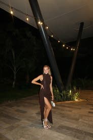 High slit and the slip under the mesh is short, so if you like me have a booty you are definitely gonna want to throw on some spanx or biker shorts or something just to avoid your full butt being out. Other than that, this dress is a dream!!! Fit is so flattering. It’s stretchy, comfortable, hugs and drapes at the waist in the most flattering way, and I didn’t even need or wear a bra! I love the rich brown color, and the quality of the material is lovely. I’m 5”2’ so the mesh went down to my ankles but truly this is one that will lay beautifully on a short or tall frame! Not black tie fancy, too body con/high slit up the thigh for a work event, but definitely the dress for a special dinner date, party, night out, birthday, NYE type vibe!